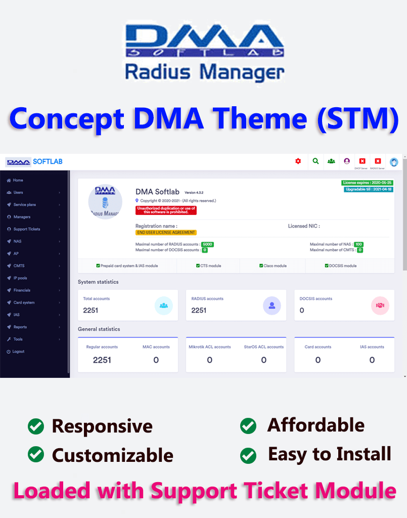 Concept (STM) DMA Radius Manager Theme is a premium bootstrap-based responsive theme loaded with the Customers Support Ticket Module. You can enjoy the responsiveness of DMA Radius Manager along with Custom Module (STM). Get rid of the old and boring theme of DMA and convert your Radius Manager Software into a Beautiful, Clean, and Responsive Theme.